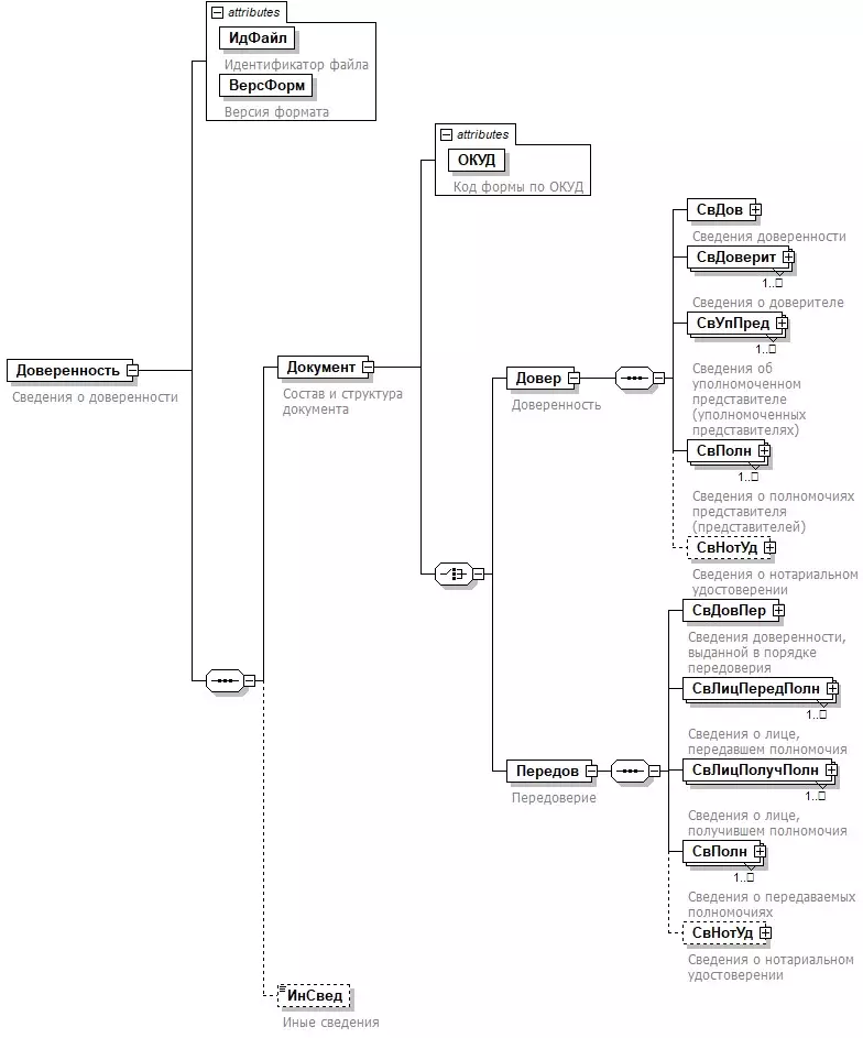 Формат предназначен для издания доверенности от российского юрлица, иностранной компании, ИП или физлица. Доверенной стороной (уполномоченным представителем) могут выступать юрлицо, ИП, физлицо. МЧД подписывается УКЭП в формате XMLDSIG или в соответствии с Форматом ЭП. В документе, опубликованном на сайте Единого портала госуслуг, содержится подробное описание требований к XML-файлу доверенности, включая диаграмму его структуры.