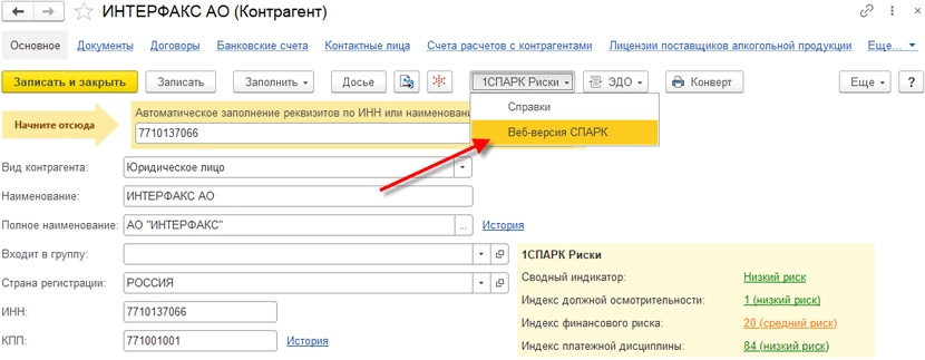 Пользователи одной из самых популярных разработок фирмы 1С – 1С:Бухгалтерия, которые работают по тарификации 1СПАРК Риски +, теперь смогут, обновив релиз своей базы до последнего – 3.0.94.17, обращаться к данным интернет-портала СПАРК непосредственно из программы. В карточку контрагента была добавлена активная кнопка-переход на сайт СПАРК, при нажатии на которую открывается карточка выбранного контрагента.