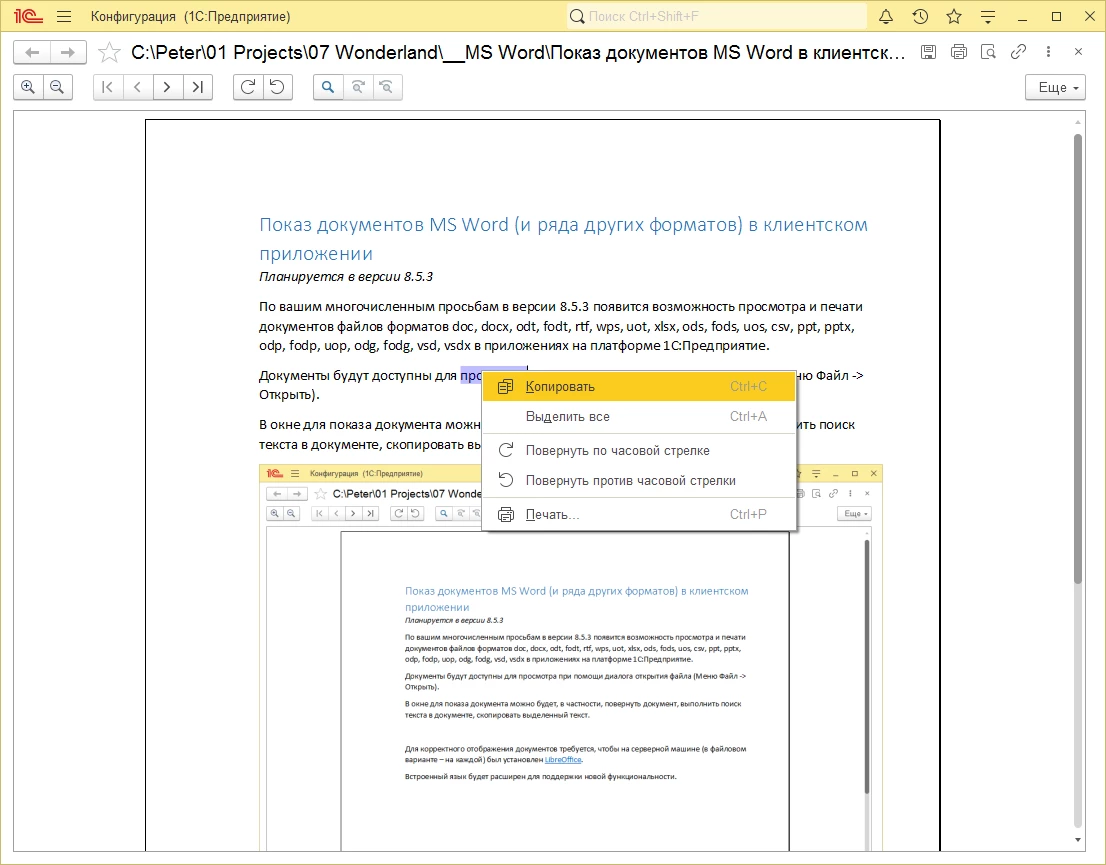 В новой версии 8.5.3 платформы 1С:Предприятие появится долгожданная возможность просмотра и печати офисных документов без необходимости использования сторонних программ. Теперь пользователи смогут открывать файлы форматов DOC, DOCX, ODT, RTF, XLSX, CSV, PPTX и других непосредственно в клиентском приложении.