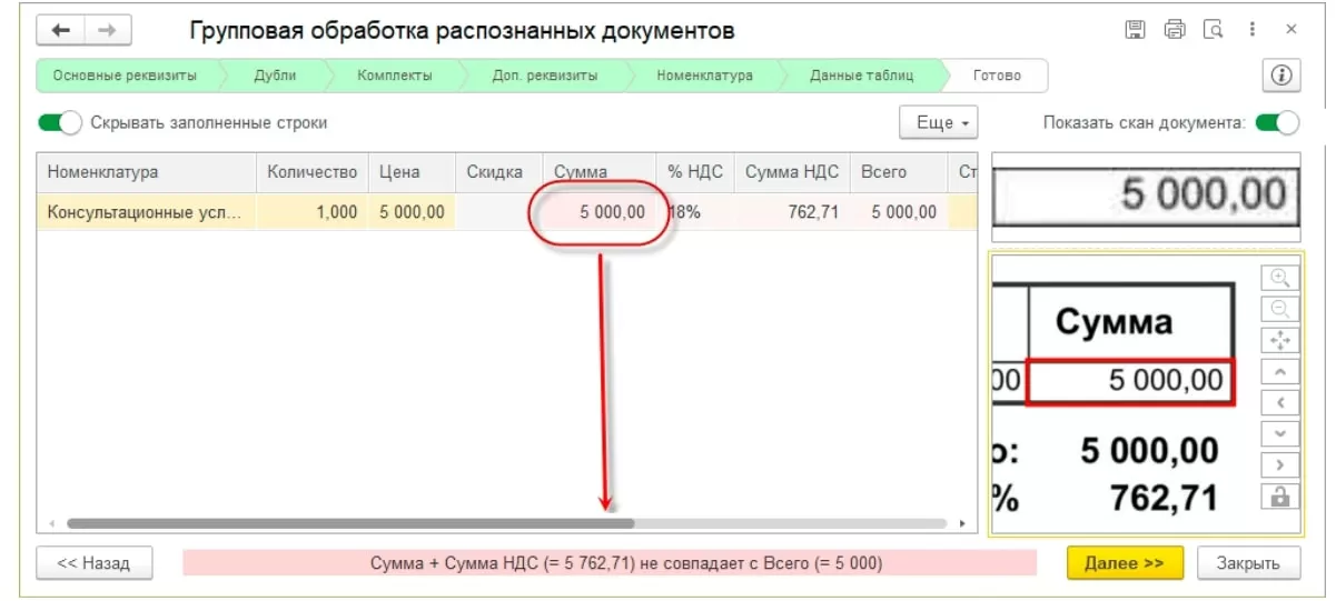 - Проверка и заполнение основных реквизитов, подсвеченных красным. При клике по проблемному реквизиту отображается подсказка нераспознанного участка скана документа для ручной корректировки. После устранения всех пробелов распознавания на данном этапе документ сразу скрывается.