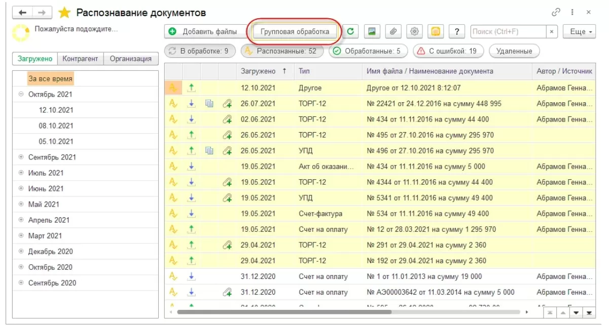 Доработаны возможности нового сервиса «1С:Распознавание первичных документов» для пользователей облачной конфигурации «1С:Бухгалтерия предприятия». Теперь можно еще быстрее загружать целые комплекты документов в вашу базу, используя новую функцию групповой обработки распознанных бумаг..