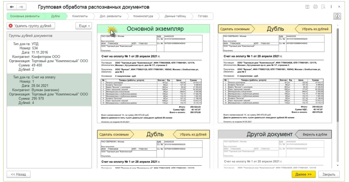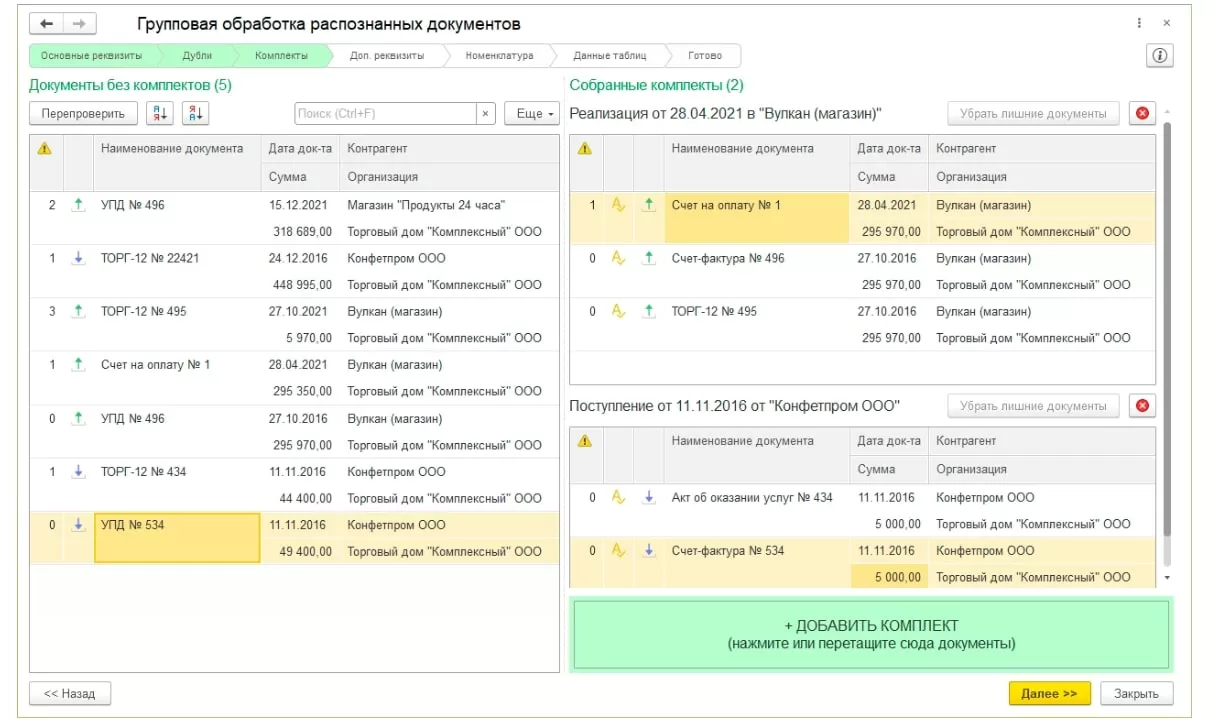 - Комплектация документов, относящихся к одной хозоперации. Сервис автоматически распределяет документы по комплектам с возможностью ручного перетягивания пропущенного скана в соответствующий комплект. Обработка реквизитов проводится в едином формате.