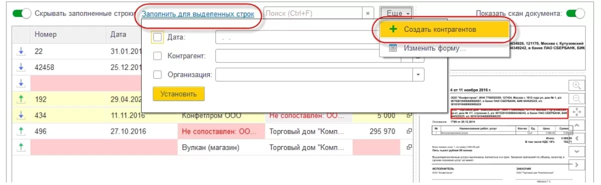 При выделении более одного документа можно сразу для всех создать новых контрагентов или внести одинаковые данные.