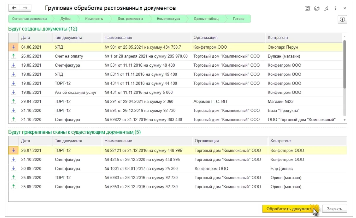 Рис. 6 Завершение процесса обработки группы документов в сервисе 1С:Распознавание первичных документов