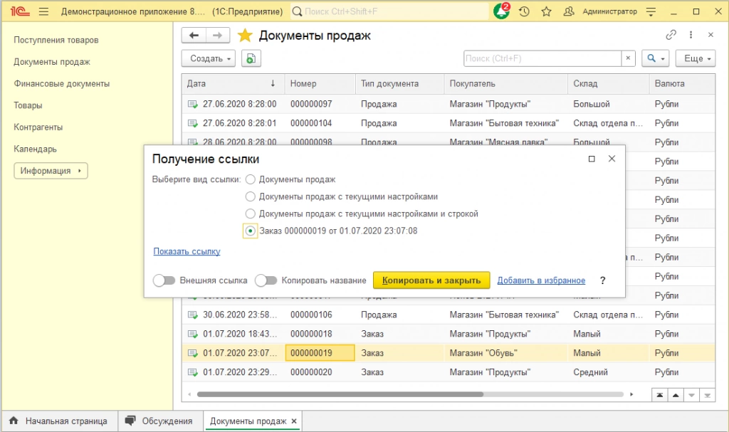 Например, можно отправить ссылку на один из документов, который представлен на экране пользователя в общем списке. Если раньше для получения ссылки на документ в списке нужно было открыть форму объекта и уже там нажать кнопку получения ссылки, то теперь в это можно сделать, не переходя к форме самого объекта, то есть напрямую из списка.