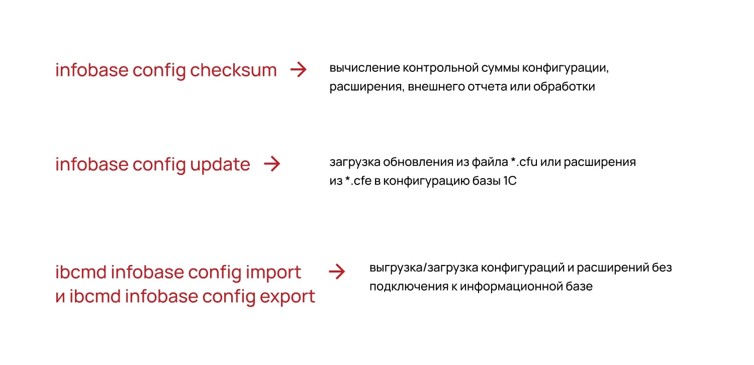 Так, команда infobase config checksum поможет узнать точно ли конфигурация инфобазы такая же как сохраненная или была дополнительно изменена. А команда infobase config update упростит автоматизацию обновлений на внедрениях с большим количеством баз, в том числе облачных по технологии Фреш.