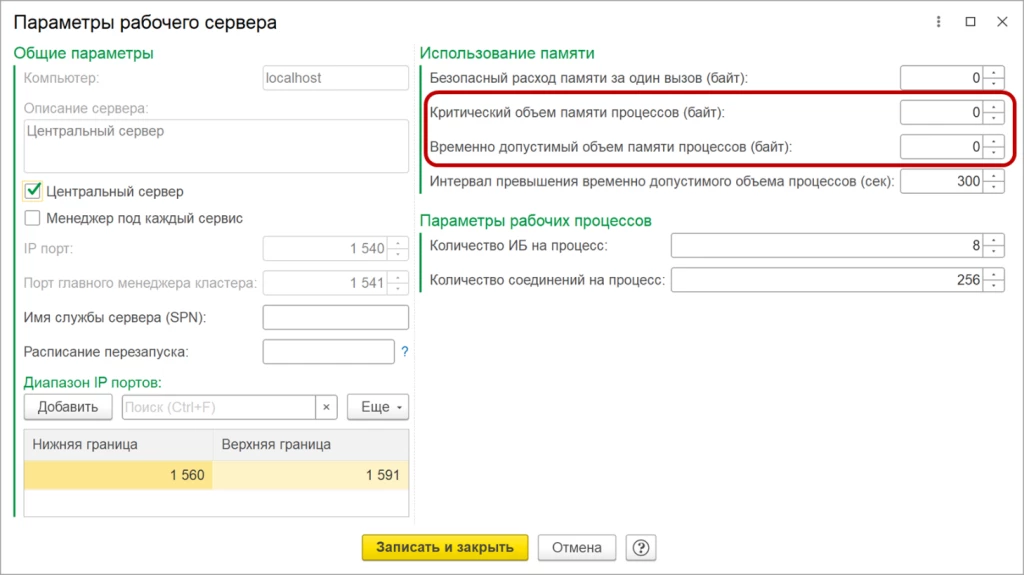 В параметрах рабочего сервера можно будет установить критический объем и временно допустимый объем памяти процессов.