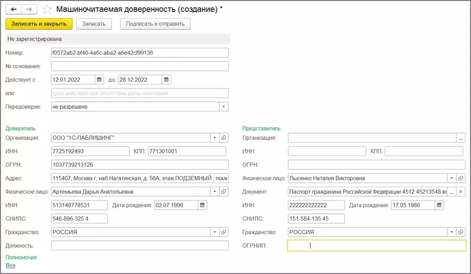 С помощью нового функционала программа сможет сформировать машиночитаемую доверенность (МЧД) и отправить в налоговую непосредственно из 1С. От сотрудника не потребуется личное присутствие и дополнительная отправка доверенности в налоговый орган.