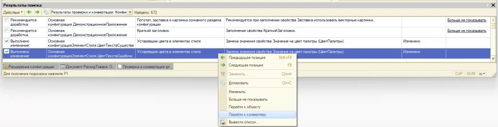 - В контекстное меню таблицы результатов конвертации добавлены команды «Перейти к конвертеру» и «Перейти к объекту» метаданных;