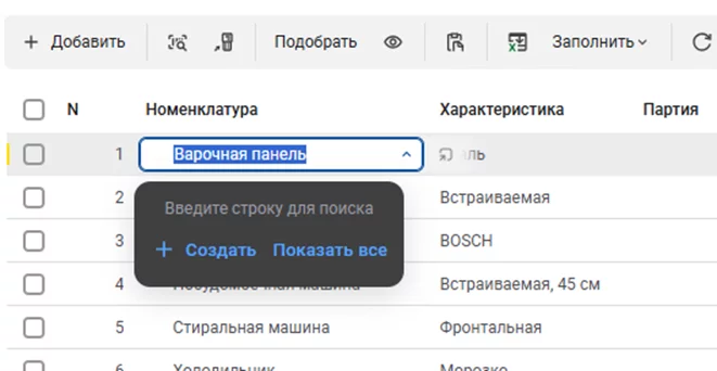 Доработана обработка кнопок поля ввода, отображаемого в таблице при наведении на ячейку. При нажатии кнопки поля ввода и наведении курсора наведении на ячейку таблицы появляется возможность выбора: «Создать новый элемент» или «Показать все».