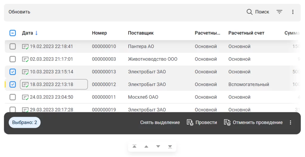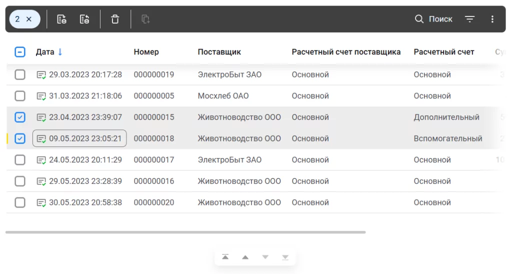 - При выделении нескольких строк показываются команды для работы с выделением (удалить, копировать и т.д.);
