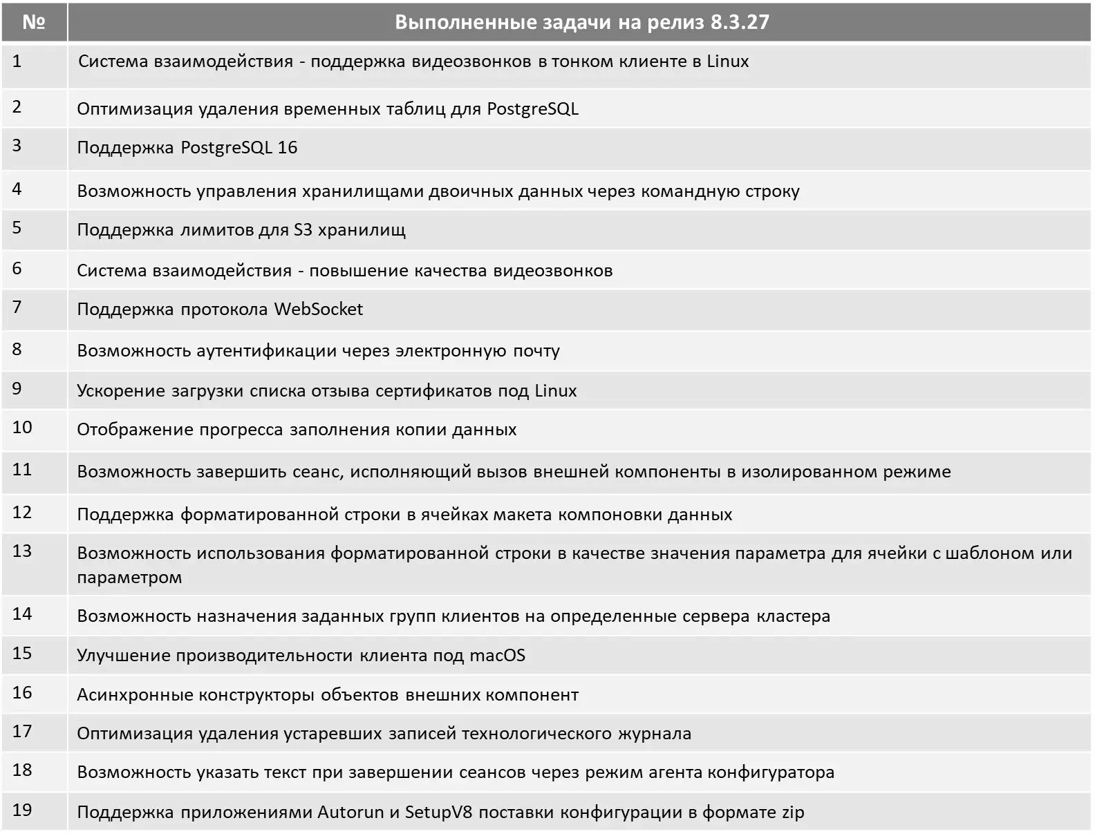 Разработчики платформы представили финальный список задач для версии 1С:Предприятие 8.3.27. Из 28 задач уже выполнены 19, остальные перенесены.