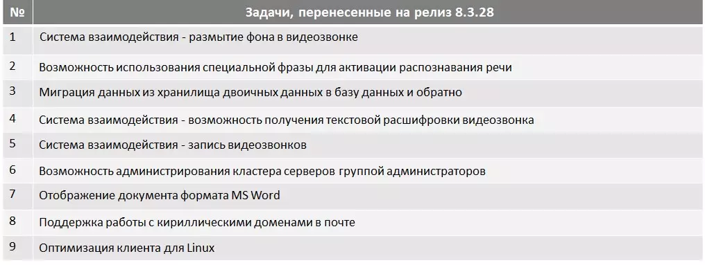Еще 9 задач перенесены на следующий релиз. Не все из запланированного удалось реализовать: по видеозвонкам, администрированию кластеров серверов, кириллицы в доменах почты и др.