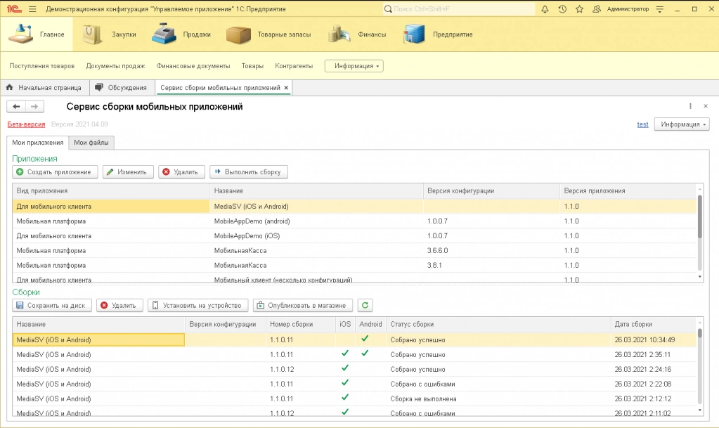 Стандартную обработку «Сервис сборки мобильных приложений» можно найти в «Функциях для технического специалиста». Обработка имеет удобный интерфейс для управления своими мобильными приложениями и их сборками.