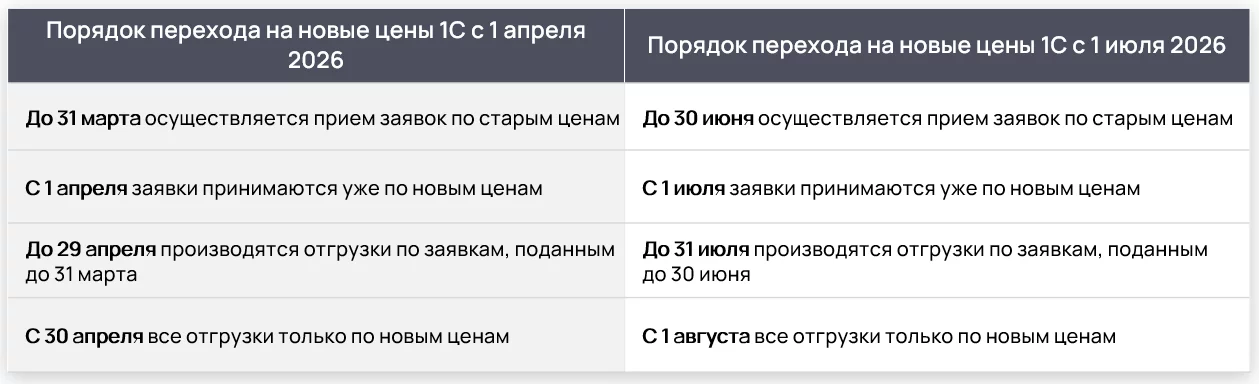 Ниже приведем примеры изменения цен на наиболее популярные типовые решения 1С с 01.04.26: