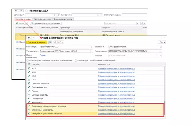 Достаточно в настройках обмена с контрагентом добавить электронные перевозочные документы: |