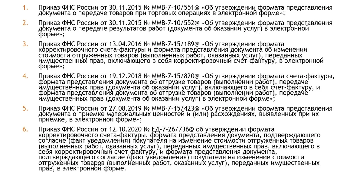При разработке были учтены форматы электронных документов, утвержденные ФНС следующими приказами: