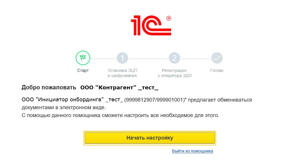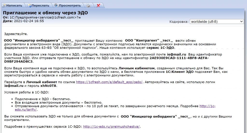 1С реализовали услугу, при которой пользователи ЭДО могут легко подключать своих контрагентов к «электронному общению». Вместе с отправкой приглашения к электронному взаимодействию, контрагенту приходит письмо с бесплатной регистрацией в 1С:Фреш и добавленным продуктом Клиент ЭДО. Для окончания регистрации контрагент должен будет обратиться к партнеру, который и подключает его к 1С-ЭДО. Также для пользователей ПП Клиент ЭДО до конца 2021 года является бесплатным в сервисе 1С:Фреш.