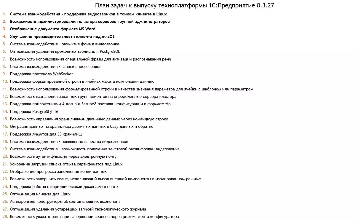 Итак, готов новый план от вендора по разработкам для технологической платформы 1С версии 8.3.27. Он включает в себя 28 пунктов, дающих общую картину ожидаемых обновлений. Как показывает практика, планы могут меняться, но не кардинально. И уже можно опираться на представленный список задач для планирования проектов и решений для автоматизации бизнеса.