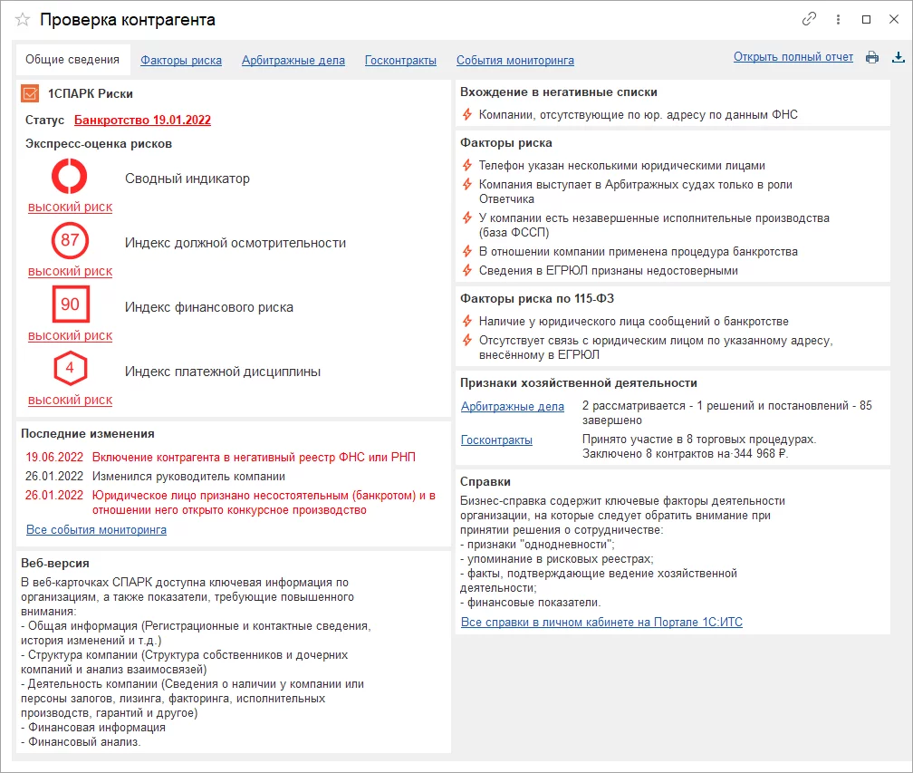 Новые проверки работают на всех действующих тарифах 1СПАРК Риски. Функционал уже встроен в последние версии популярных конфигураций: