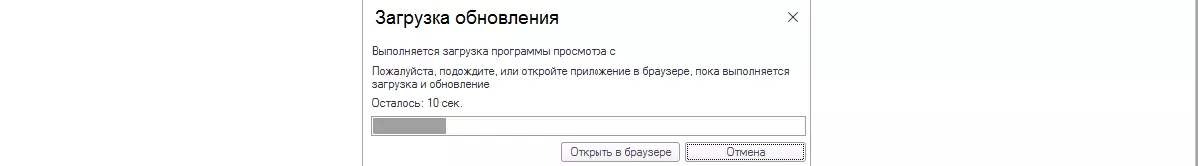 Если пользователю потребуется начать работу сразу, не дожидаясь окончания обновления, он сможет нажать Открыть в браузере и начать работу в веб-клиенте. Эта кнопка будет доступна только в случае, если подключение к инфобазе осуществляется по протоколу HTTP.