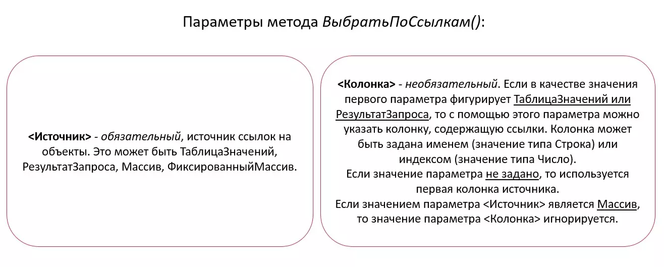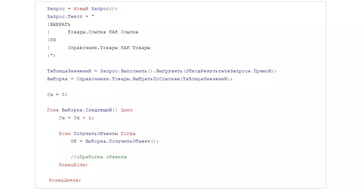 Новый метод аналогичен стандартному Выбрать(), тоже возвращает выборку объектов соответствующего типа и считывает объекты порциями. Отличием является итоговая коллекция ссылок на нужные объекты. А для целостного считывания объектов необходимо совершить дополнительные действия.
