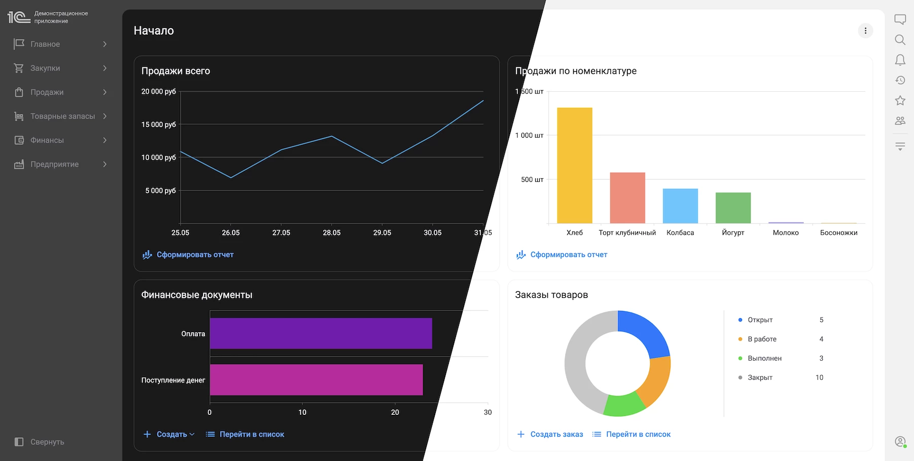 Цветовая гамма 1С:Предприятие станет в нейтральных серых тонах. Многие любят работать в полумраке, вечерами, когда яркий экран компьютера вреден для глаз. Теперь при работе с 1С можно будет использовать также темную тему интерфейса. Это очень полезное нововведение.