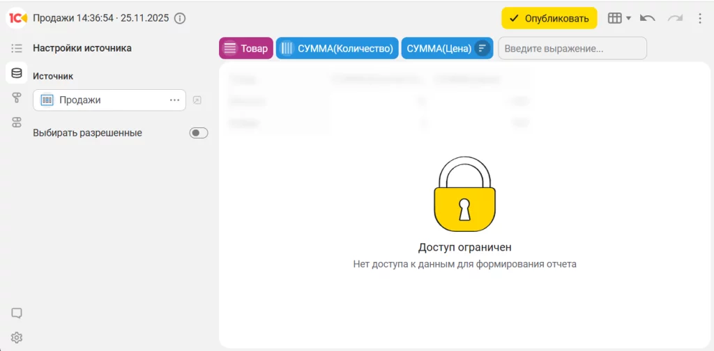 - Когда настройка отключена: отчет строится исключительно при условии полного доступа пользователя ко всем требуемым источникам данных. Если доступ к какому-либо источнику отсутствует, появляется ошибка с уведомлением о невозможности сформировать отчет.