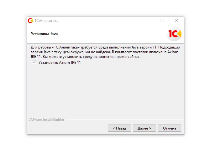 Теперь установщик для Windows включает в себя Java – Axiom JRE 11, которая требуется для запуска серверной части 1С:Аналитики. Инсталлятор самостоятельно установит эту среду, если пользователь даст согласие.