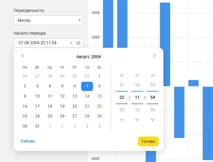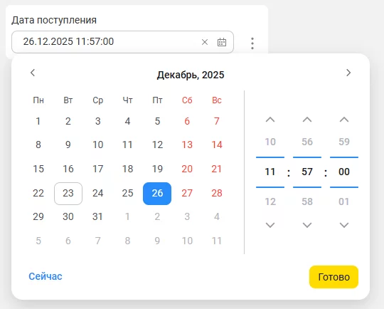 Система пополнилась новым удобным выпадающим календарем, который существенно улучшает работу с датами и временем. Теперь доступно быстрое задание текущих дат и точное выставление временных рамок вплоть до секунд.