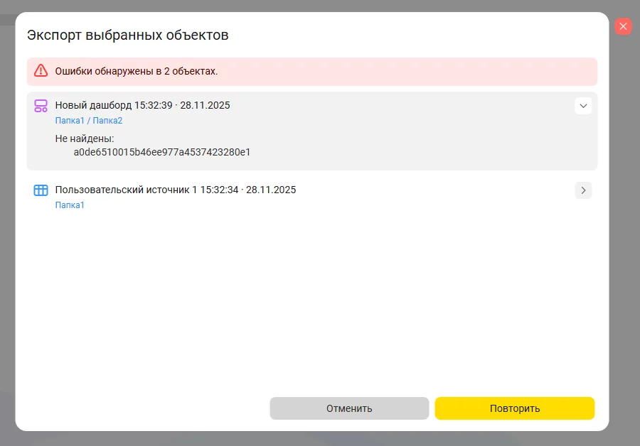 Во время экспорта структуры отчетов иногда возникают ситуации, когда некоторые объекты отсутствуют. Раньше экспорт останавливался без детализированной информации. Сейчас система подробно объясняет причину проблемы, указывая объект, ссылающийся на несуществующий элемент, и перечисляя сами отсутствующие объекты. Это значительно упрощает диагностику и исправление ошибок.