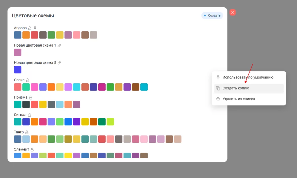 - Предпросмотр стандартных и привязанных схем. Вы можете посмотреть существующие цветовые решения, примененные системой или другими пользователями, однако прав на их редактирование у вас не будет. Это позволяет оценить варианты оформления перед принятием собственного решения.