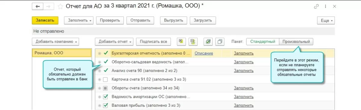 Появились новые механизмы для отмены в составе пакета ненужных отчетов и формирования пакетов «Стандартный» или «Произвольный» - один для обязательного перечня, а другой для тех отчетов, которые могут быть исключены.