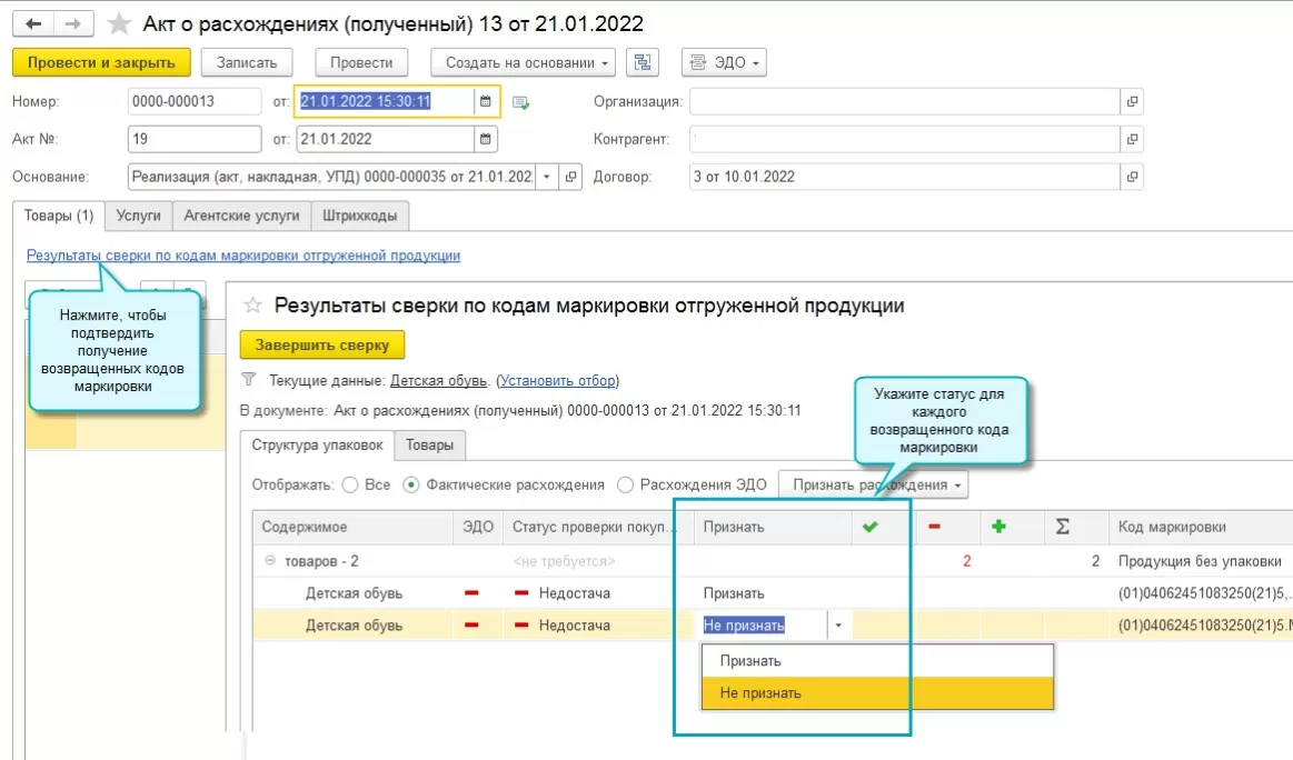 Коды маркировки в Бухгалтерии 3.0.107. Результаты сверки признаются по каждому наименованию