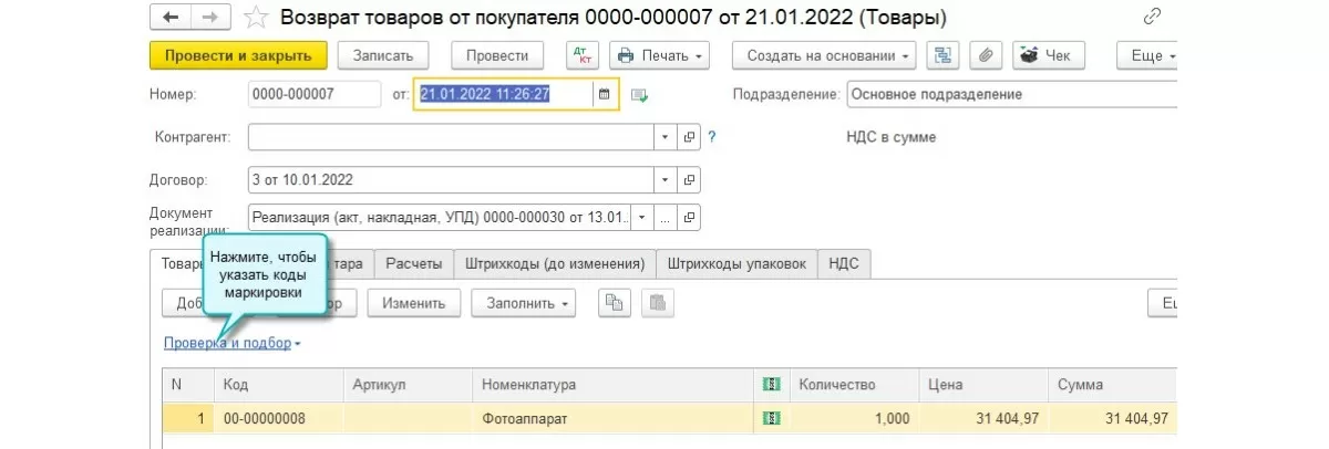 Новая и такая нужная функциональная опция была учтена в документах «Возврат от покупателя» и «Корректировка реализации».