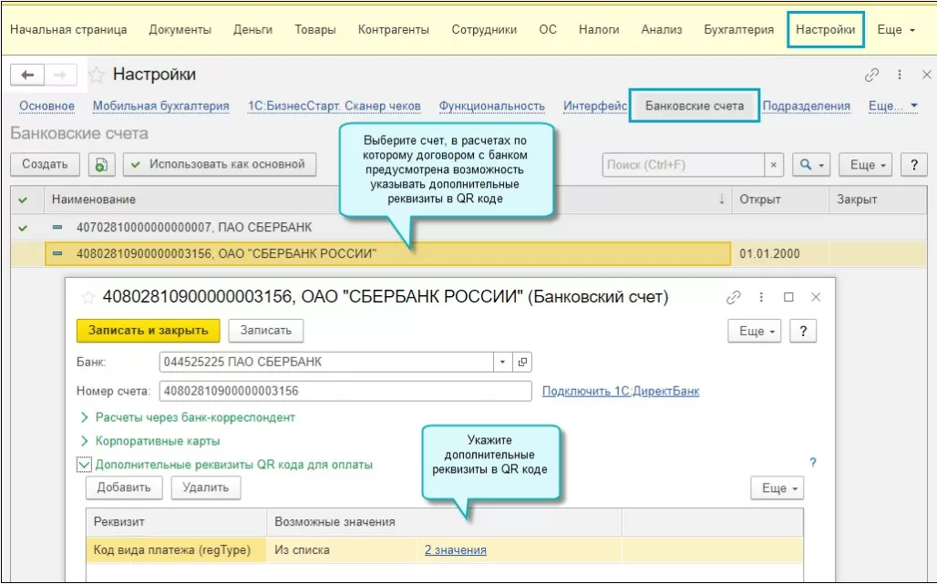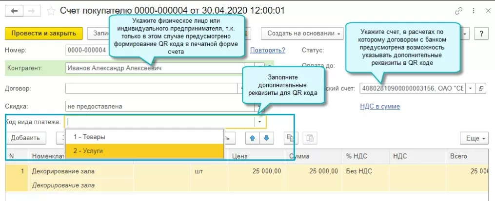 Теперь, если в договоре с банком оговорена возможность указания дополнительных реквизитов в QR-коде, то такая возможность уже есть. Мы можем заполнить дополнительные платежные реквизиты в QR-коде в документе «Счет покупателю».