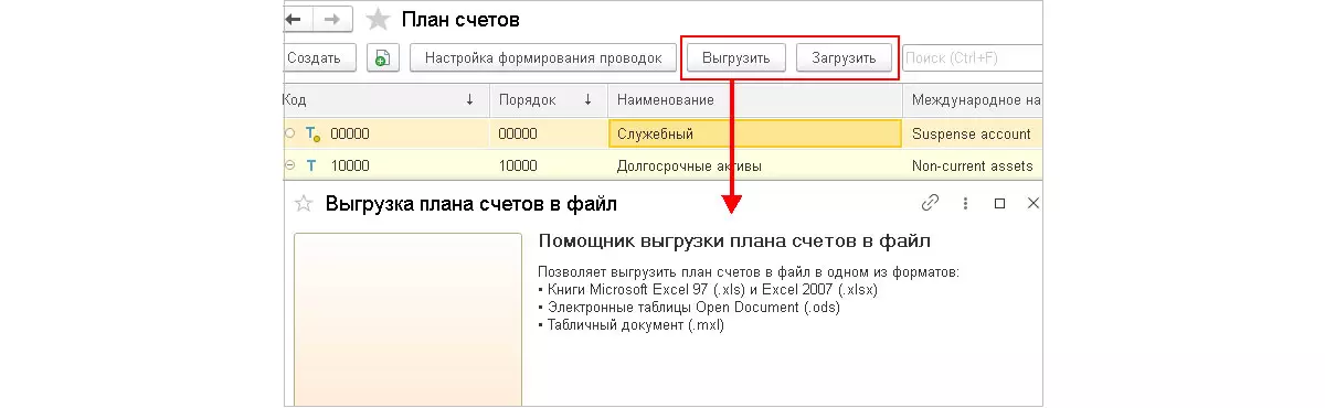 При переходе из других систем добавлена возможность выгрузки и загрузки планов счетов международного финансового учета из таблицы, содержащейся в файле в одном из следующих форматов: .xls, .xlsx, .ods, .mxl.