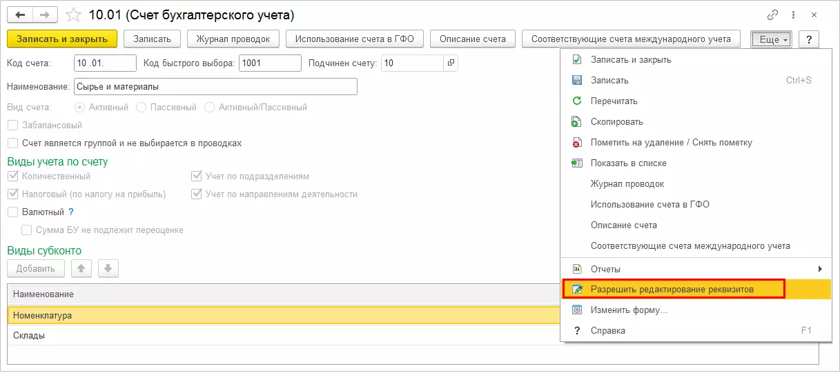 Редактирование выполняется по кнопке «Разрешить редактирование реквизитов»: