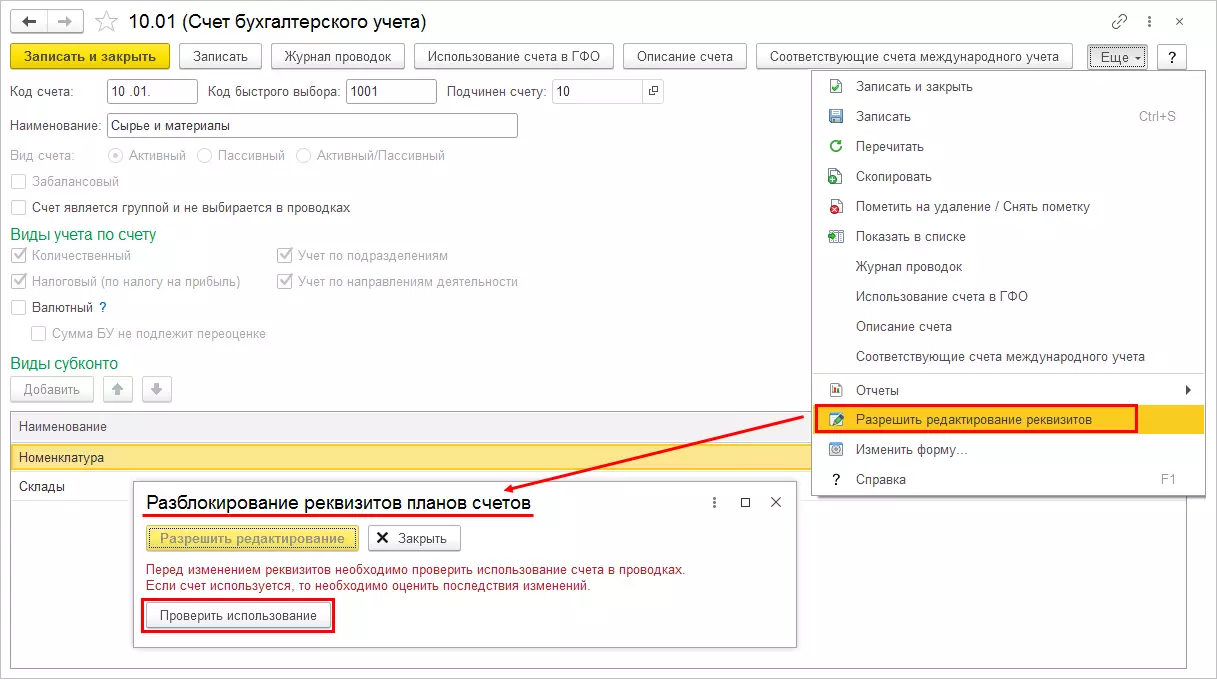 Если счет не используется в проводках, тогда по кнопке «Разрешить редактирование» в форме «Разблокирование реквизитов планов счетов» его реквизиты становятся доступны для редактирования.