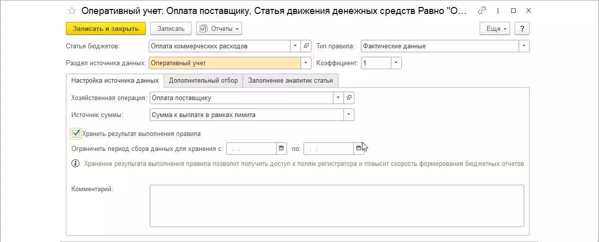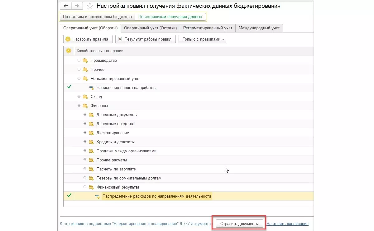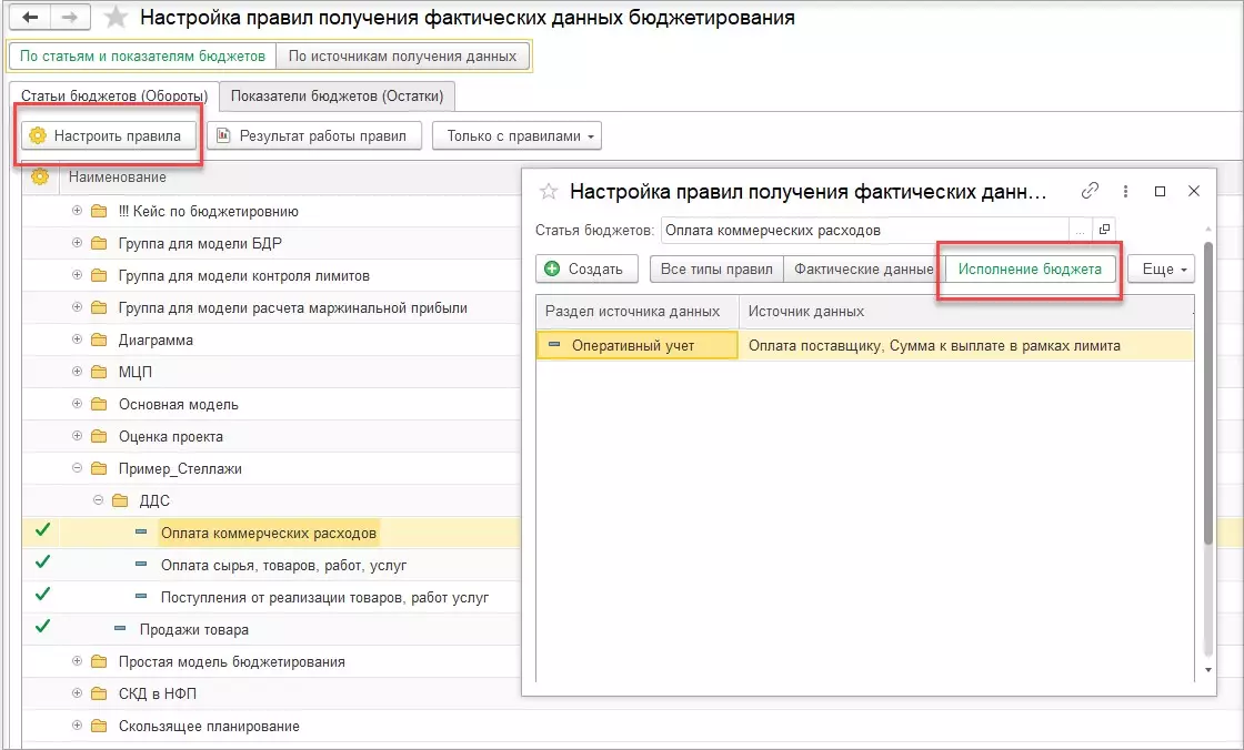 - После установки флажка сохранения результатов по всем правилам получения факт. данных их нужно отразить в бюджетировании.