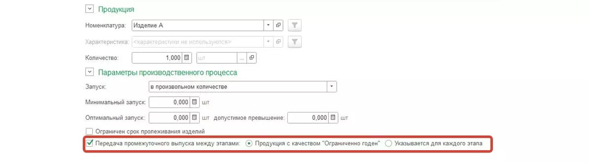 В предыдущих версиях для описания промежуточных полуфабрикатов требовалось добавлять одну и ту же номенклатуру в табличные части материалов и выпуска двух этапов производства. Начиная с релиза 2.5.16, была добавлена опция Передача промежуточного выпуска между этапами с двумя режимами: