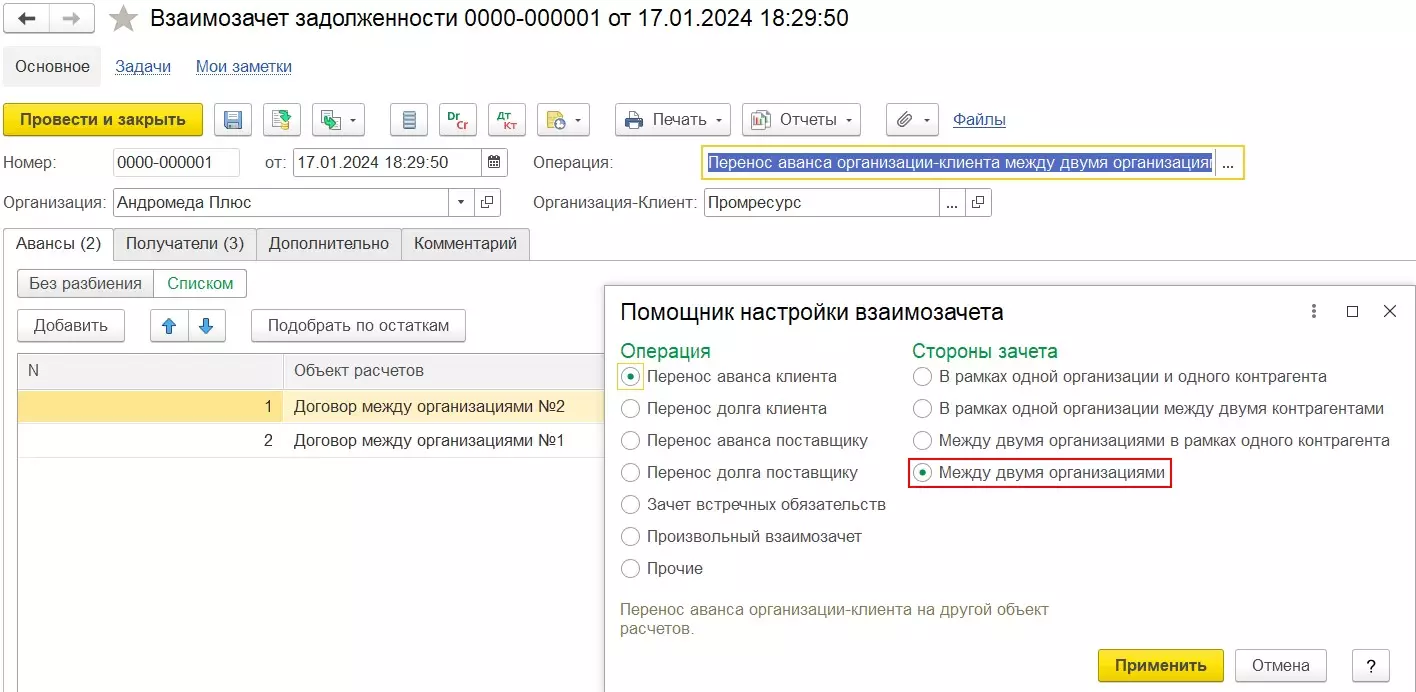 Улучшен документ Взаимозачет задолженности. Добавлена возможность взаимозачета между двумя организациями без вмешательства третьих компаний путем добавления нового метода зачета.