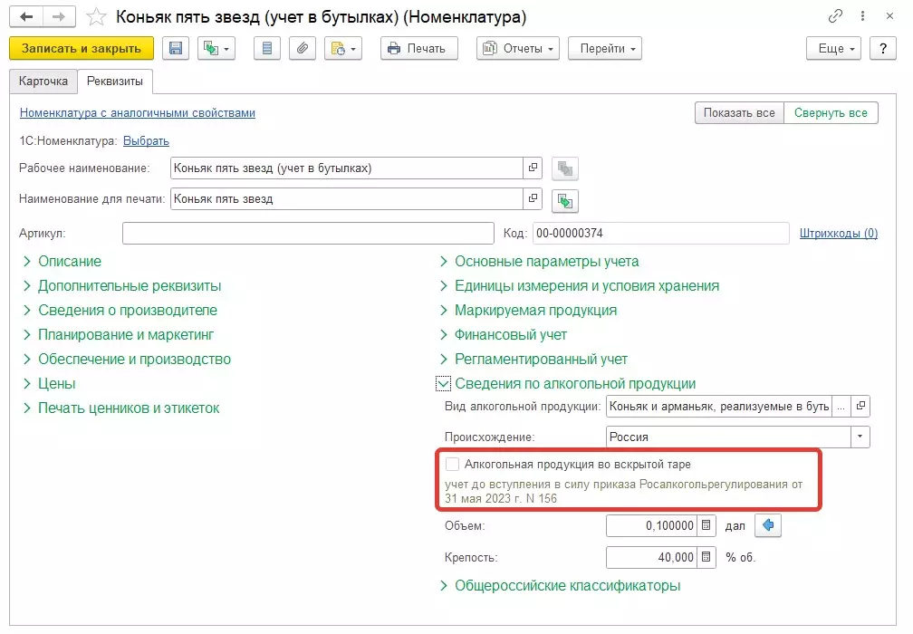 Внимание: важно убрать флажок Алкогольная продукция во вскрытой таре в группе реквизитов Сведения по алкогольной продукции в соответствии с приказом Федеральной службой по регулированию алкогольного рынка от 31.05.2023 г. N 156.