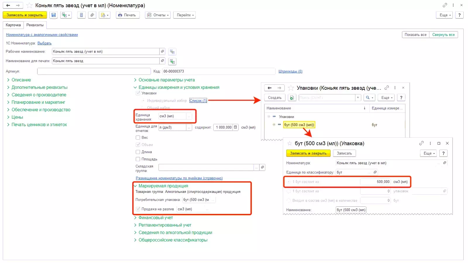 Общепиту, продающему алкоголь порционно, нужно единовременно оперировать и промаркированными бутылками, и единицами частичного выбытия – миллилитрами. В складском учете можно указать единицей хранения как (мл), так и тару.