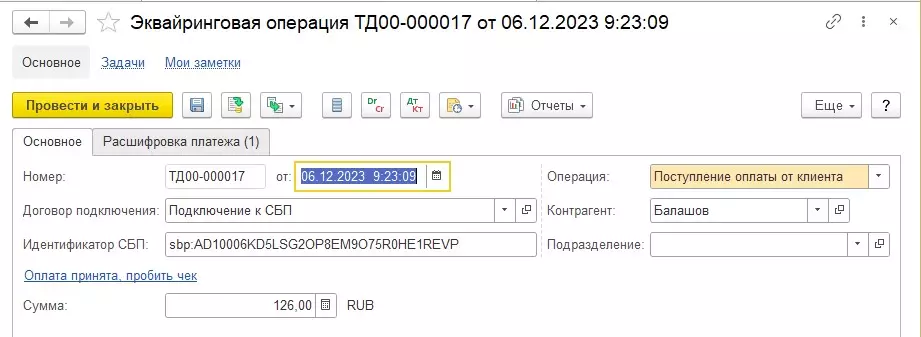 Существует возможность генерации и немедленной отправки через SMS, по электронной почте ссылки или QR-кода оплаты прямо в форме документа. В системе такая оплата будет отражена в документе Эквайринговая операция. Поступление денежных средств (как и начисленная комиссия, и многое другое) отражается в Отчете банка по эквайрингу.