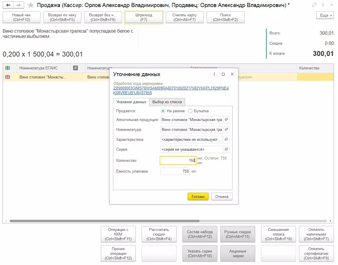 Оформить продажи алкогольной продукции в розлив можно и через РМК - документ Реализации товаров и услуг.