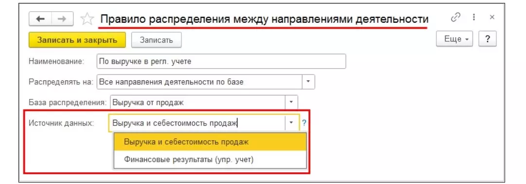 Аналогичный реквизит был также добавлен в документе Распределение расходов между направлениями деятельности. В рамках этого документа добавлена возможность определения, в каких случаях будет применяться источник данных.