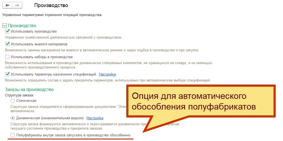 Добавлена функциональная опция «Полуфабрикаты внутри заказа производить обособленно». Она включает обособленное производство полуфабрикатов по умолчанию, а также «спасет» зарезервированное сырье от перехвата более приоритетными заказами.