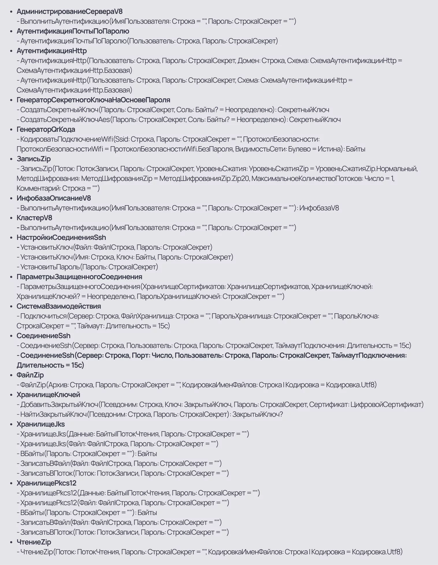 В ряде методов и конструкторов параметр Пароль теперь может иметь объединенный тип Строка|Секрет вместо только Строка. Это повышает безопасность обработки паролей и секретных данных.