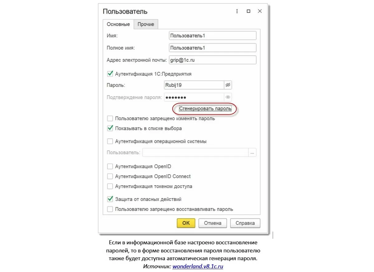 В числе прочих улучшений в Конфигураторе в параметрах пользователя для настройки аутентификации в «1С:Предприятии» будет доступна гиперссылка «Сгенерировать пароль». Пароль, сгенерированный при помощи этой гиперссылки, будет легко запомнить, но не легко угадать или подобрать т.к. в нем будут чередоваться гласные и согласные буквы, а цифры располагаться или в конце, или в начале.